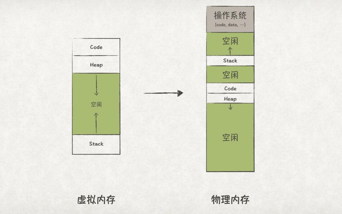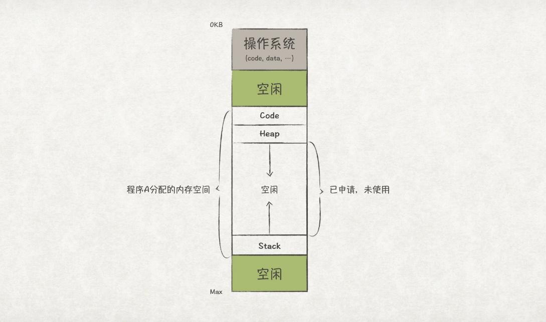 为了实现程序间内存的隔离,OS对物理内存做了一层虚拟化。OS为每个程序都虚拟化出一段内存空间,这段虚拟内存空间会映射到一段物理内存上。但对程序自身而言,它只能看到自己的虚拟地址空间,也就有独占整个内存的错觉了。