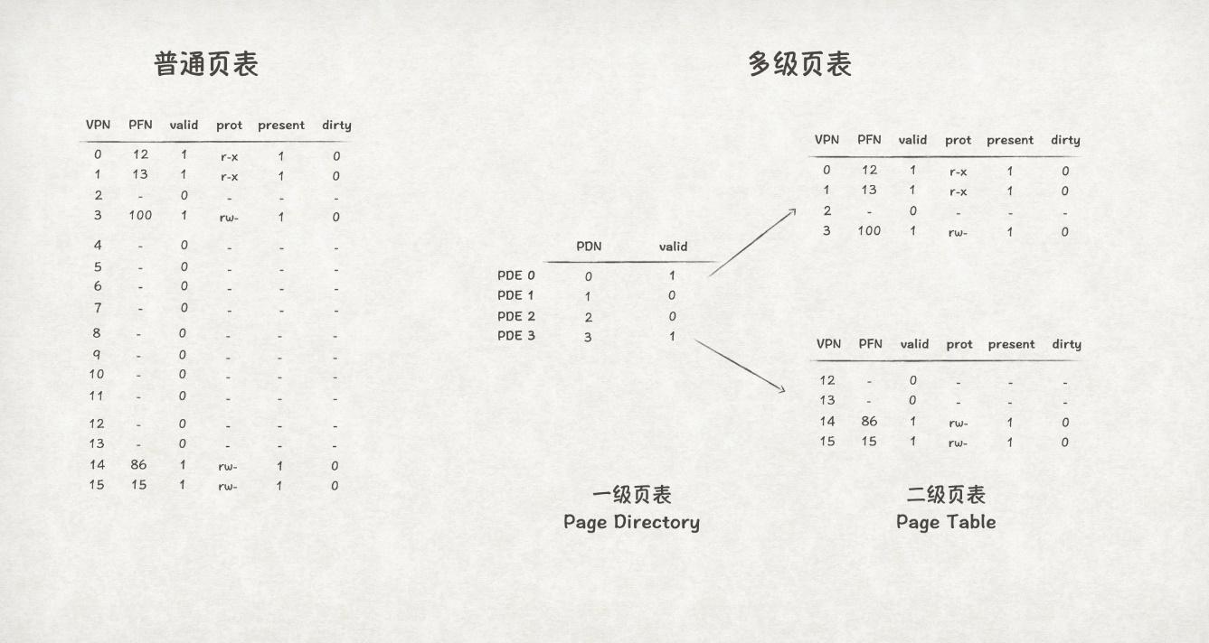 以二级页表为例,下图对比了普通页表和多级页表的构成差异: