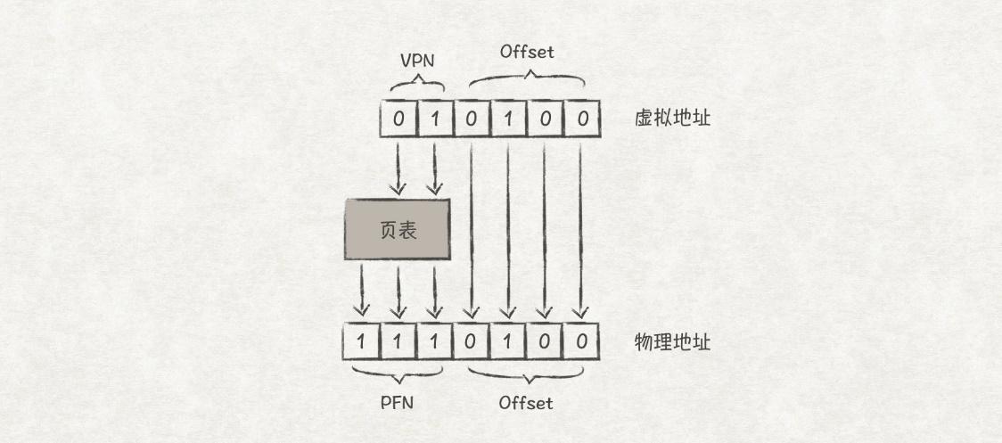 我们可以将虚拟地址划分成两部分,分别存储VPN和Offset,这样就能通过VPN找到PFN,从而得到PFN+Offset的实际物理地址了。