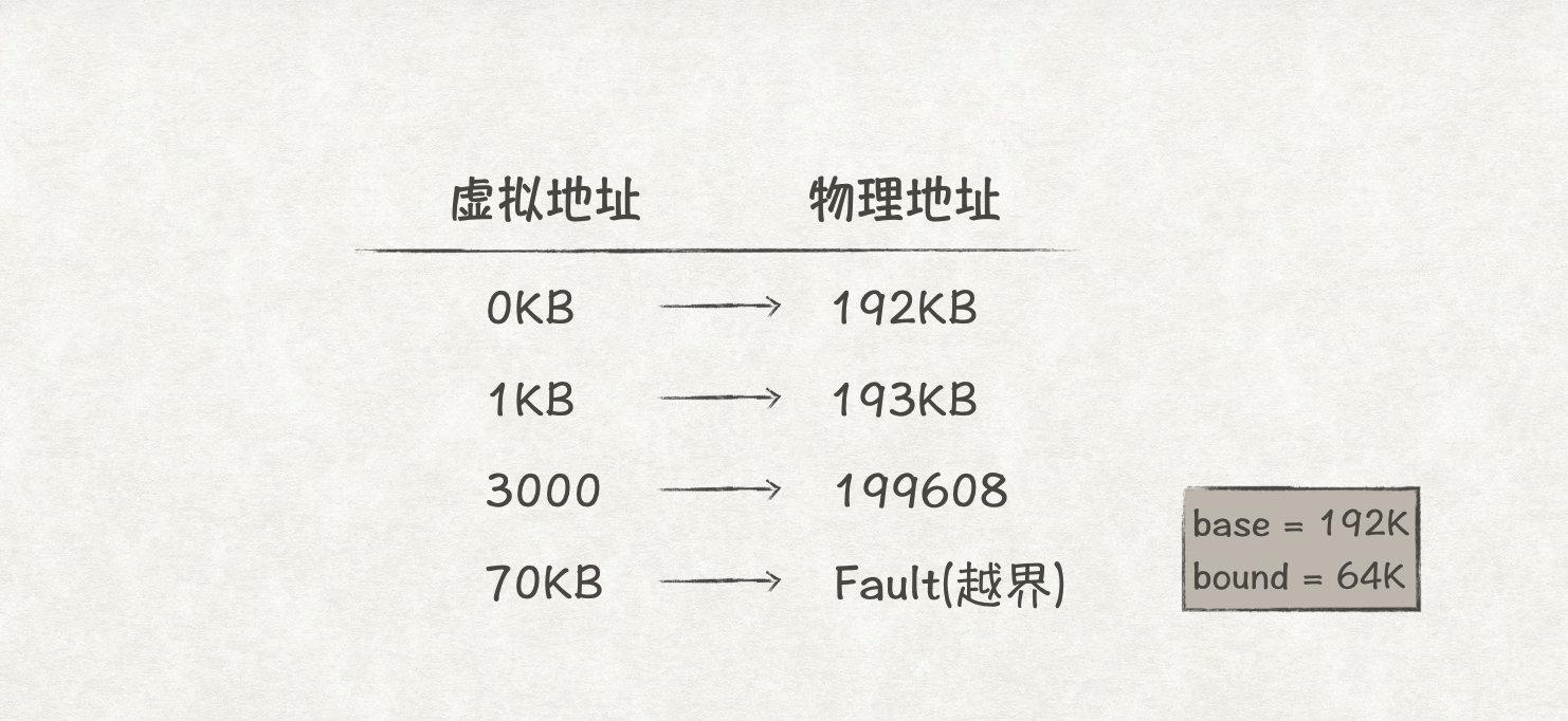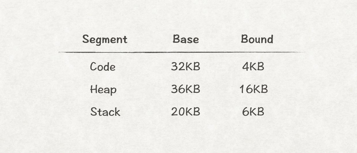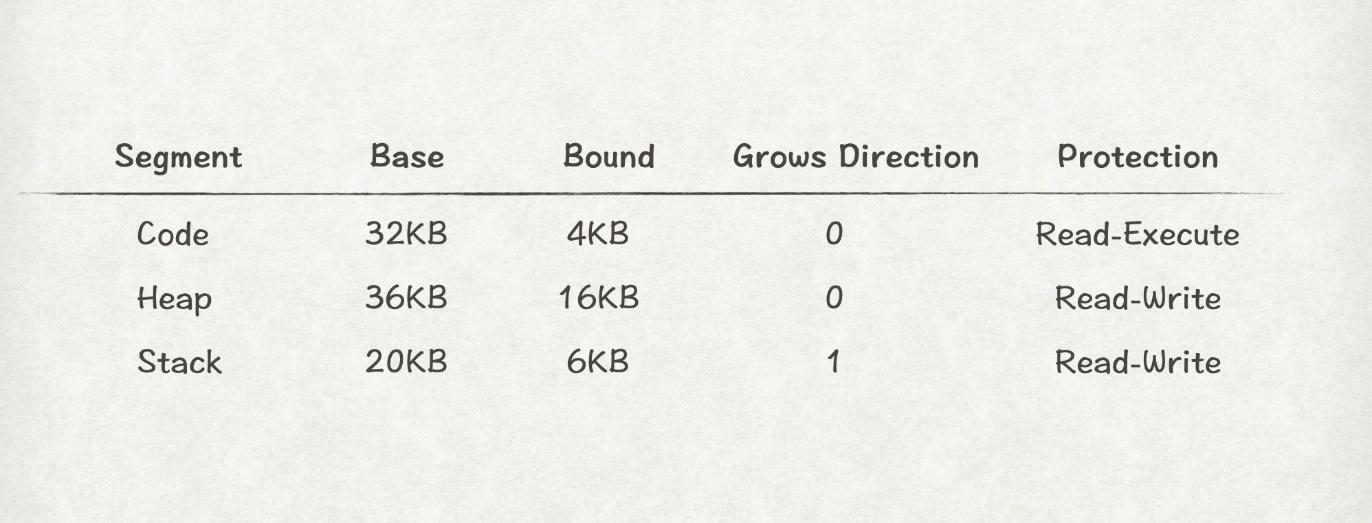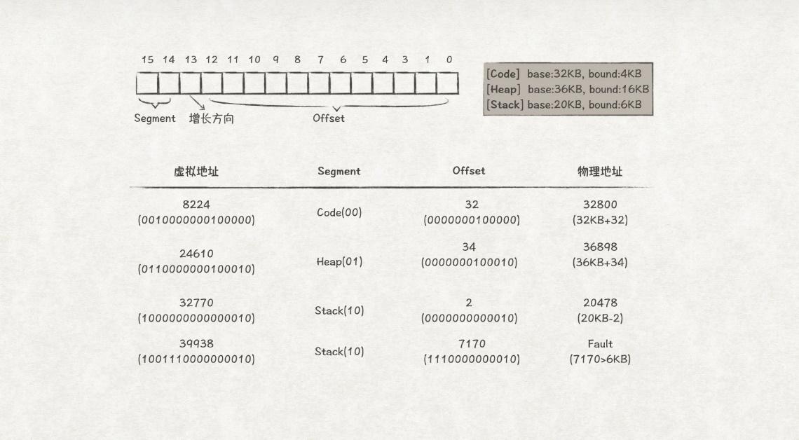 // 获取当前虚拟地址属于哪个段 Segment = (VirtualAddress & SEG_MASK) >> SEG_SHIFT // 得到段内偏移量 Offset = VirtualAddress & OFFSET_MASK // 获得内存增长的方向 GrowsDirection = VirtualAddress & GROWS_DIRECTION_MASK // 有效性校验 if (Offset >= Bounds[Segment]) RaiseException(PROTECTION_FAULT) else if (GrowsDirection == 0) { PhysAddr = Base[Segment] + Offset } else { PhysAddr = Base[Segment] - Offset }