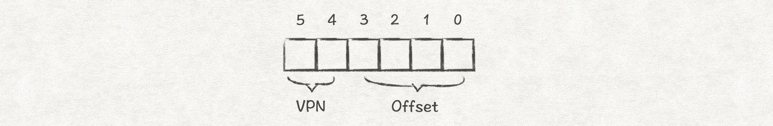比如,假设虚拟内存空间大小为64Byte(6位地址),页的大小为16Byte,那么整个虚拟内存空间一共有4个页。因此我们可以使用高2位来存储VPN,低4位存储Offset: