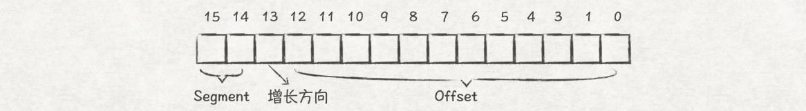 但这样还不是能够顺利的将虚拟地址转换为物理地址,我们忽略了重要的一点:Heap段和Stack段的增长方向是相反的,这也意味着两者的地址转换方式是不一样的。因此,我们还必须在虚拟地址中多使用一位来标识段的增长方向,比如0表示向上(低地址方向)增长,1表示向下(高地址方向)增长: