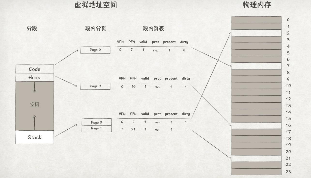 具体的方法是,为程序的地址空间划分出多个段,比如Code、Heap、Stack等。然后,在每个段内单独进行页式管理,也即为每个段引入一个页表: