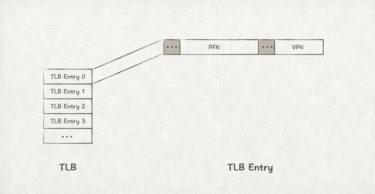 VPN = (VirtualAddress & VPN_MASK) >> SHIFT (Success, TlbEntry) = TLB_Lookup(VPN) if (Success == True) // TLB Hit if (CanAccess(TlbEntry.ProtectBits) == True) Offset = VirtualAddress & OFFSET_MASK PhysAddr = (TlbEntry.PFN << SHIFT) | Offset else RaiseException(PROTECTION_FAULT) else // TLB Miss PTEAddr = PTBR + (VPN * sizeof(PTE)) PTE = AccessMemory(PTEAddr) if (PTE.Valid == False) RaiseException(SEGMENTATION_FAULT) else if (CanAccess(PTE.ProtectBits) == False) RaiseException(PROTECTION_FAULT) else TLB_Insert(VPN, PTE.PFN, PTE.ProtectBits) RetryInstruction()