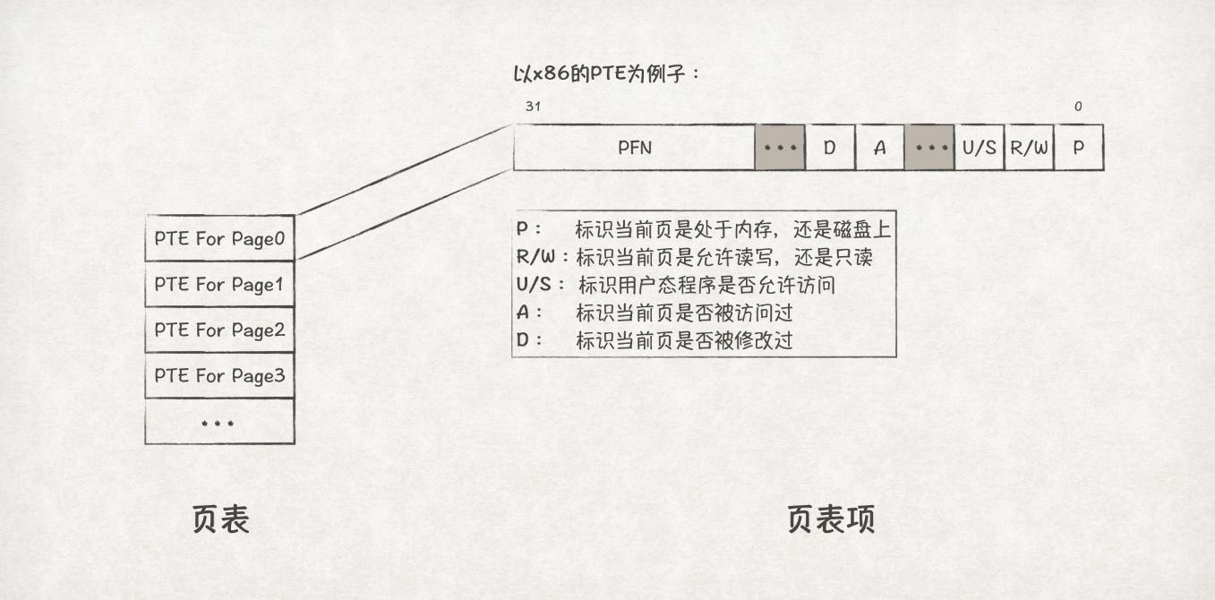 以x86系统下的PTE组成为例,PTE一共占32位,除了PFN之外,还有一些比较重要的信息,比如P(Present)标识当前页是否位于内存上(或是磁盘上);R/W(Read/Write)标识当前页是否允许读写(或是只读);U/S(User/Supervisor)标识当前页是否允许用户态访问;A(Access)标识当前页是否被访问过,在判断当前页是否为热点数据、页换出时特别有用;D(Dirty)标识当前页是否被修改过。