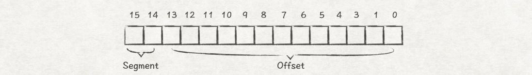 假设虚拟地址有16位,因为只有3个段,因此,我们可以使用虚拟地址的高2位来作为段标识,比如00表示Code段,01表示Heap段,11表示Stack段。这样MMU就能根据虚拟地址来找到对应段的base-bound寄存器了: