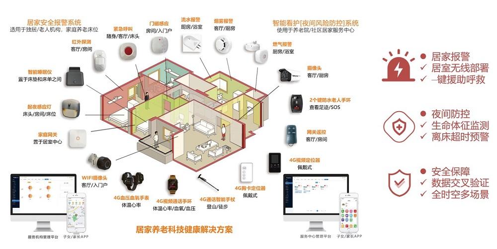 为此,云巢加速器提供了相对完备的硬件解决方案,打通硬件定制研发的各个环节,完全围绕ISV业务场景定制硬件。 以下图的居家养老科技解决方案为例,从门磁感应、烟雾报警到房间内的红外探测、起夜感应灯,以及老人佩戴的血氧手表、胸卡定位器,都可以针对具体需求和场景定制。