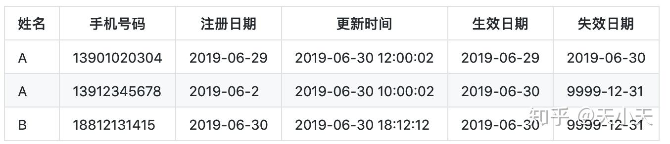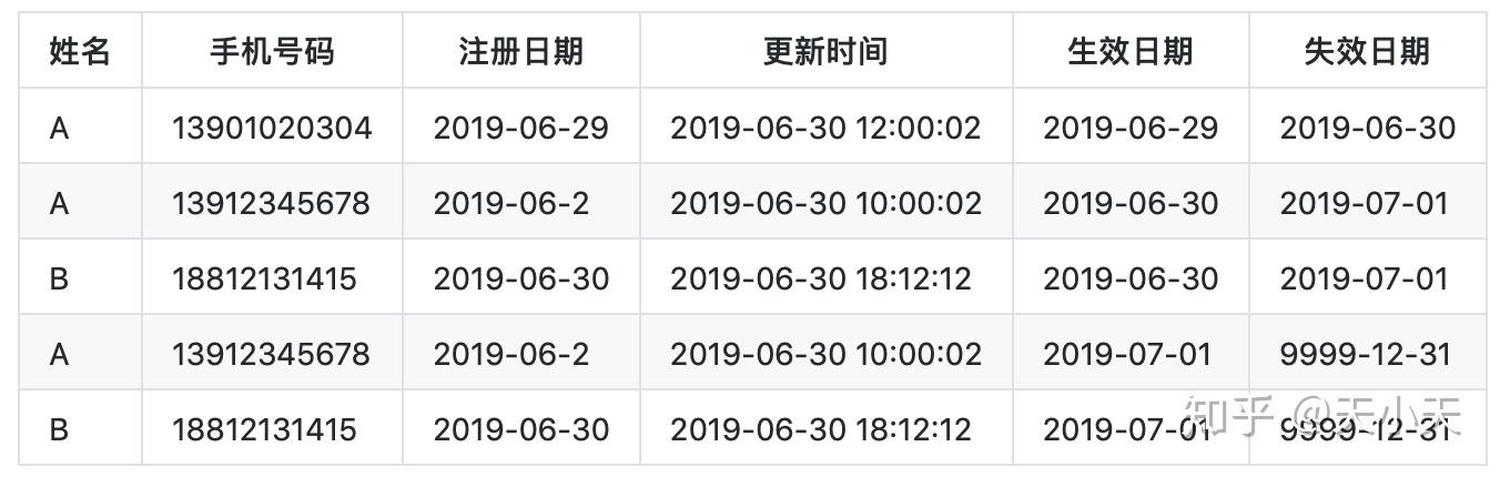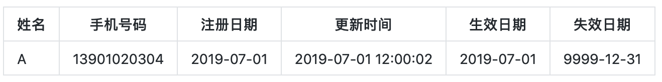 一条是更新手机号码之后(即2019-07-02日)的记录,并且生效日期为2019-07-02,失效日期为9999-12-31