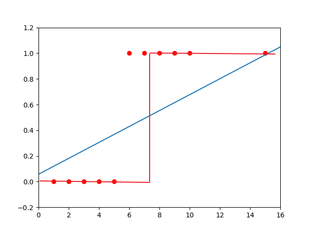 到现在为止看起来线性回归干得不错,但是当我们在数据中加一个噪声点(15,1)的时候: