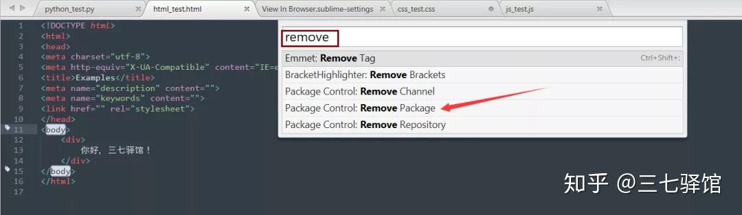有时候我们需要移除自己不想要的插件,具体操作如下:快捷键 Ctrl+Shift+P,在对话框中输入“remove”,选择“Package Control: Remove Packages”。