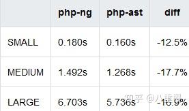 以下结果是使用小(代码大约 100 行)、中(大约 700 行)、大(大约 2800 行)三个脚本分别进行测试得到的,测试脚本: https://gist.github.com/nikic/289b0c7538b46c2220bc