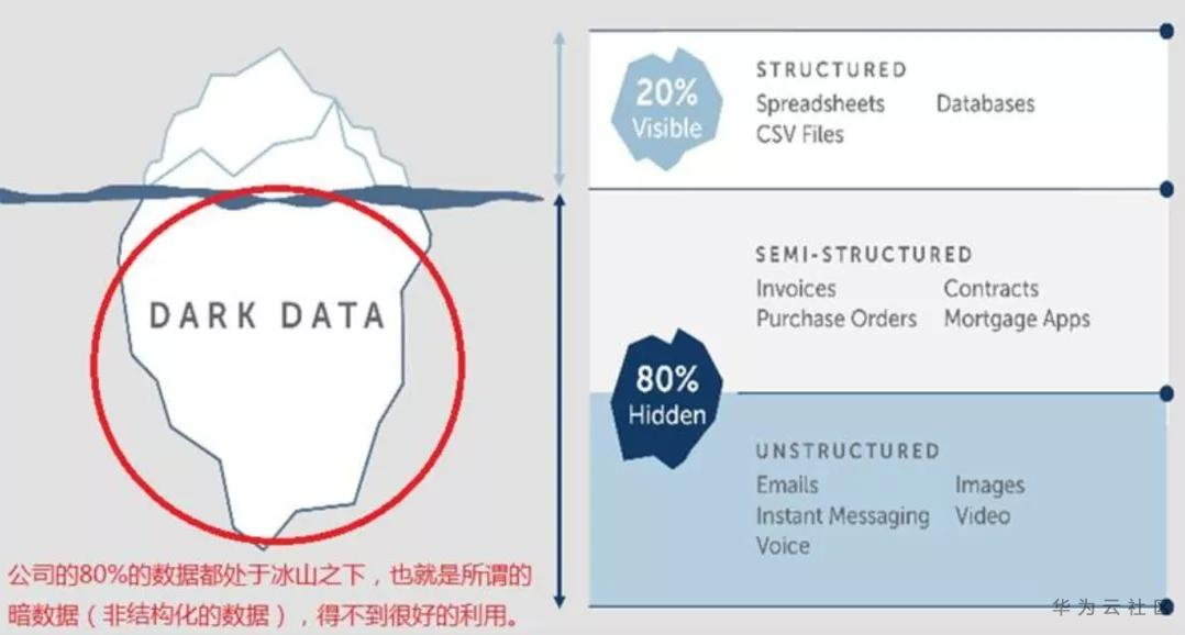 AA公司统计“暗数据”占比达80%,就像下图冰山在水下的部分。这些暗数据,导致信息是断裂的,传统的自动化不能访问。业界最头疼的就是如何处理这部分数据?
