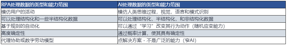 下面列举了AI和RPA的差异点: