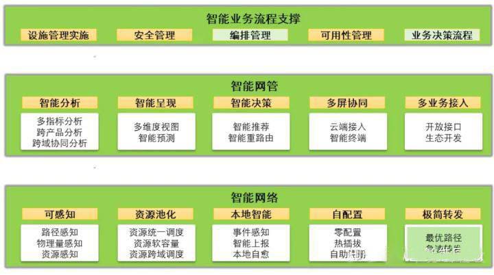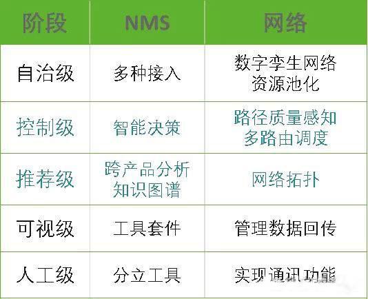 现在自动驾驶网络仿照自动驾驶汽车分了5级,但是因为网络有自身特点,这种直接照搬的网络级别定义比较难理解,不好实际操作。我按照可能的产业实际发展路径,对网络管理和网络本身设置了阶段性的目标,也分了5级。当前因为网络产品本身自动恢复的能力还比较弱,网络还处在推荐级,实现的功能大部分应该聚焦在网络感知能力的提升上,比如自动故障发现,故障原因推荐等功能实现上。等未来网络产品能力增强后,网络有质量感知和重路由功能后,网络实现的能力就变成了控制级。最后网络可以接入多种环境,完成支撑多种业务的时候,网络就实现了完善的自动驾驶网络功能。