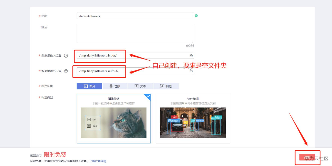 然后先在“数据集输入位置”和“数据集输出位置”选择2个OBS上的文件夹(文件夹要自己创建,必须是空文件夹),剩下的部分默认就行,之后点击右下角创建即可。