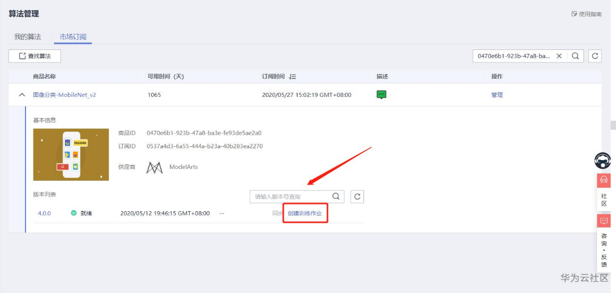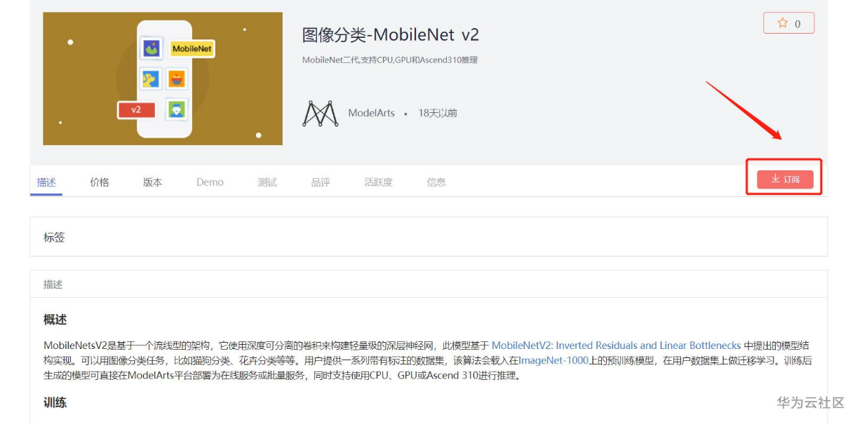 下面开始训练,这里首先要到AI市场,订阅算法,放心,是免费的,点击链接进入算法订阅 https://console.huaweicloud.com/modelarts/?region=cn-north-4#/aiMarket/aiMarketModelDetail/overview?modelId=0470e6b1-923b-47a8-ba3e-fe93de5ae2a0&type=algo