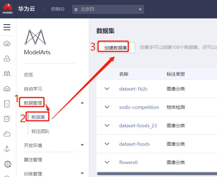 上传好了之后,回到ModelArts首页,点击左侧“数据管理”->“数据集”,然后点击“创建数据集”