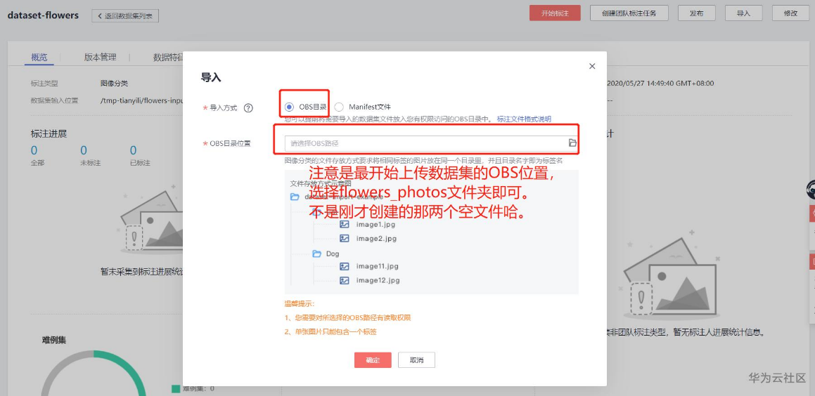 点击导入后,选择最开始上传数据集的路径,就是选择flowers_photos文件夹。