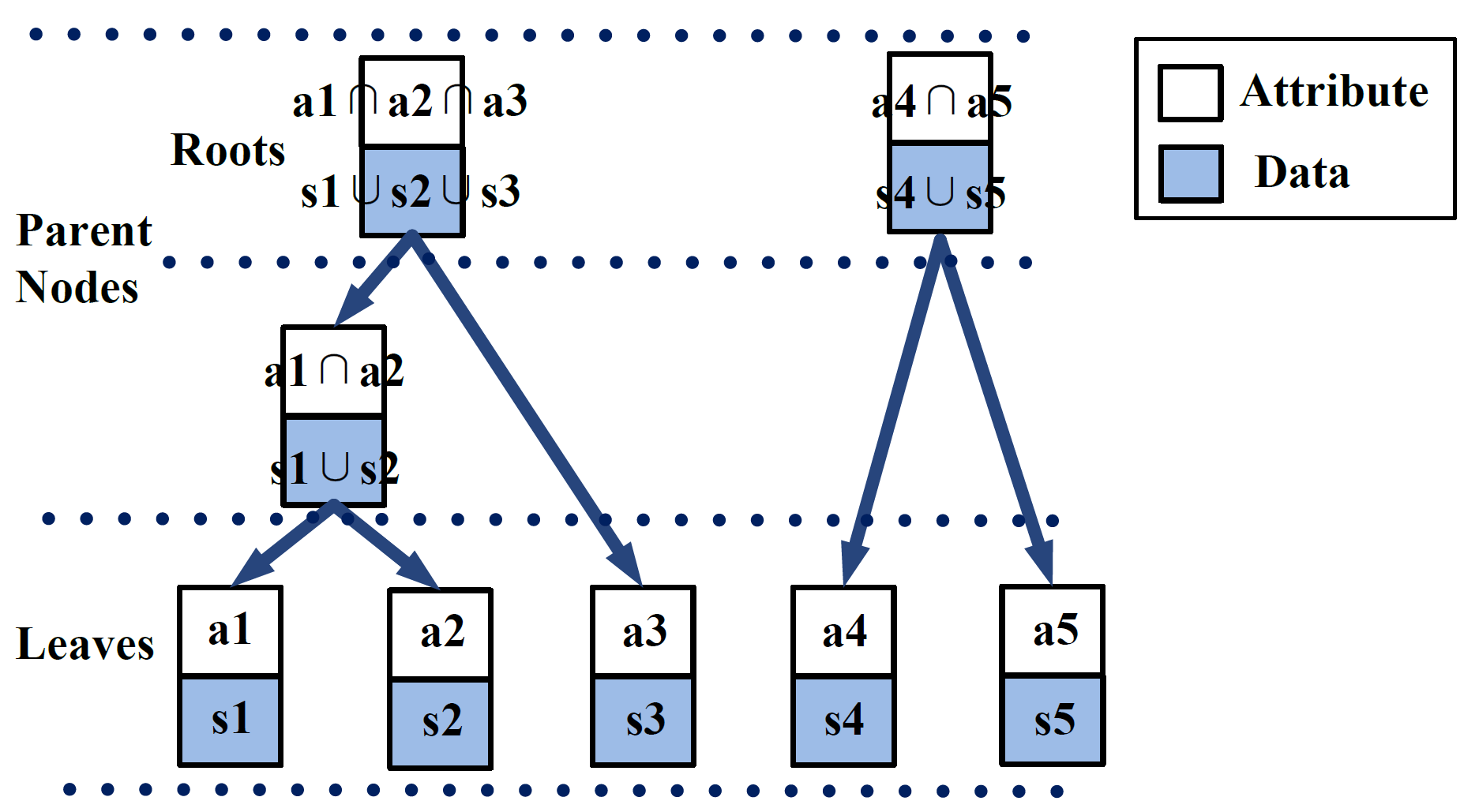 图6 任务森林的例子:数据表示模型训练样本,属性表示模型应用范围;节点表示子任务,包括数据、属性和模型(若有);森林的每个根节点,也即每棵树的顶点,表示各个子任务合并成的一个任务。对任务森林初始化和维护等具体实现和算法复杂度等证明,有兴趣的读者可以阅读论文附录。