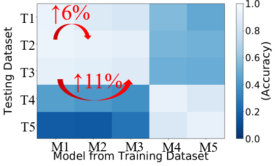 但目前预测任务的配置,例如所需模型的数量以及模型的应用范围,仍然是一个开放性问题。为了深入研究此问题,该团队进一步验证多任务设定而非单任务设定,也即观察多个模型在多个测试集上的性能。在一个实际建筑物中,使用了从冷机1到冷机5的训练数据集训练了5个模型(以下称为M1 - M5)。然后在另外5个测试数据集(T1 - T5)的不同场景中测试了5个模型的性能。实验及其结果分别如图5-1、5-2所示。