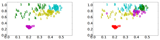图1 颜色代表不同聚类簇,数字代表不同设备型号。基于样本属性的方法容易导致负迁移(同一簇中混淆不同型号设备模型,左图),而基于元数据的方法可以避免负迁移(右图)。