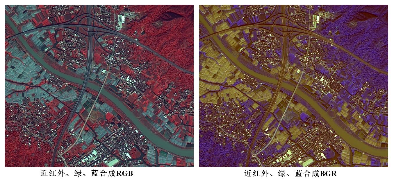 下图是将某幅遥感影像的近红外、绿、蓝波段分别组合成RGB、BGR后的显示效果。可植被区域分布偏红和偏蓝,因为植被在近红外波段反射较强,其像元值较其他波段大。