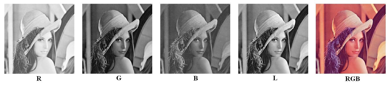 下图是对图像处理领域著名的测试图像(lena)的RGB以及真实的亮度L进行灰度显示的结果,最右侧为该测试图像的原始彩色图。这个图像整体偏红,所以R通道进行灰度显示时整体偏亮。从B波段的灰度显示结果可以看出头发部位似乎有剐蹭痕迹,也许是扫描这副图像的杂志用过很多次了吧。