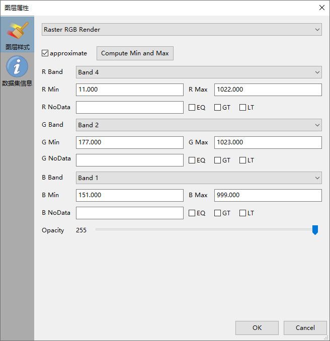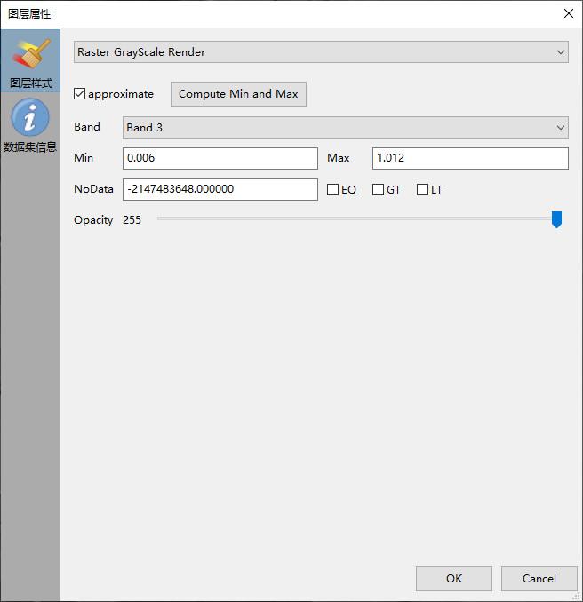 只需要一个数值就能表示灰度,灰度显示可视化方式用于观察栅格数据某一个波段内部数值的差异情况。灰度显示是将波段的像元值按照设定的最大最小值线性映射到0-255然后直接当作亮度进行显示。下图是灰度显示的设置,只需选择要进行灰度显示的通道,统计或者指定最大最小值。