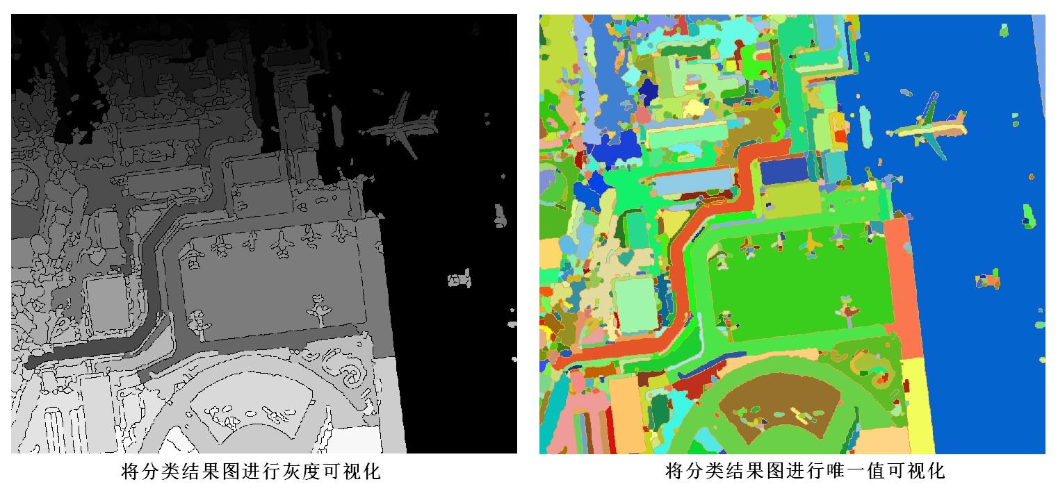 下图是某个算法分割结果分别用灰度可视化和唯一值可视化的效果。可以看出用唯一值可视化时,分割图斑更加清晰。