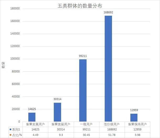 可以看出:最有价值的3类用户占比约为20%。这20%的用户必然贡献了广告点击率的绝大部分,平台如果希望广告效果好,就需要投入资源服务好这部分用户