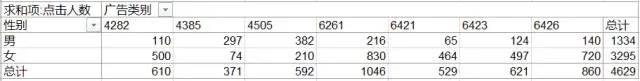 男女之间的主要差异是由类型6261的广告造成的,女性的点击数大约是男性的4倍。