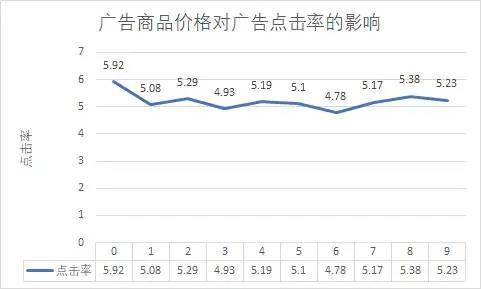 从图中发现,所有价格区间商品的点击率都在5%左右,其中广告商品价格在100元以下的广告点击率最高,为5.92%;