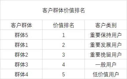 根据聚类结果,对应上述五类客户类型,进行匹配,得到客户群体的价值排名: