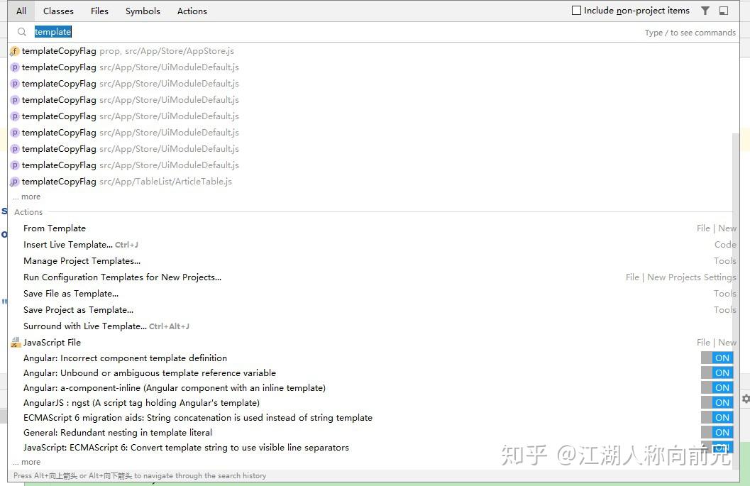 如下如所以,输入模板 template,既可以搜到代码中有关template关键字的代码文件,又可以搜到和template相关的设置。