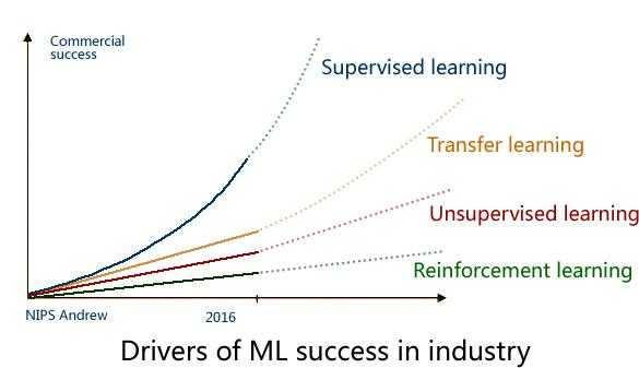 监督学习(Supervised learning)是目前商用场景最多,成熟度最高的AI技术,而下一个商用的AI技术将会是迁移学习(Transfer Learning),这也是 Andrew 预测未来五年最有可能走向商用的AI技术。