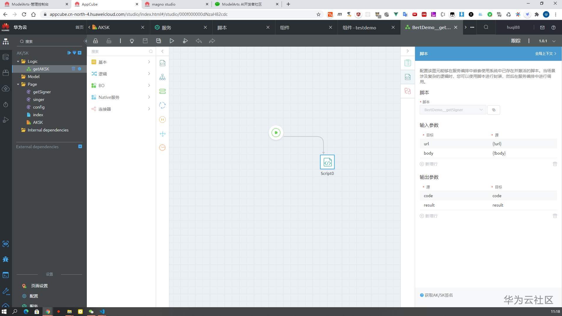 理论上,我们的前端业务是不直接调用后端接口的,这次的探索,我们把调用AI在线服务交给APPCube的后端逻辑了来处理,由APPCube开发的前端业务调用后端业务,由AppCube的后端业务去调用AI在线服务,这样尽可能保障了我们传输过程中使用的敏感数据如AKSK不被泄露。于是,我们需要编写脚本,还需定义服务流、公共接口等,具体可查阅官方文档。如图中,我们定义了三个脚本:config--简单配置AKSK及AI在线服务地址;singer--签名用的,根据AKSK提供的Demo改写使之适应AppCube;getSinger--也就是调用服务的脚本,输入body,返回请求AI在线服务的响应。