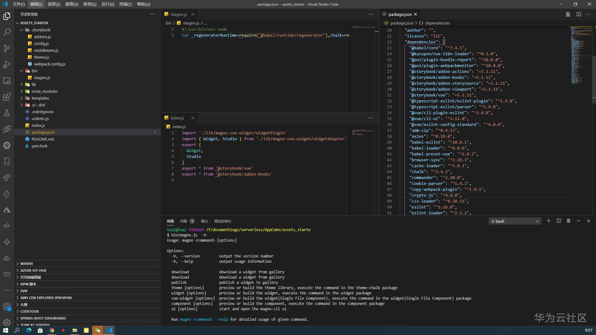 对了Widget的概念非常不错,玩出来Flutter的感觉,万物皆Widget!您在浏览器中看到的一个系统网页,即是一个页面。Widget是可复用的高级页面组成元素,一个高级页面由一个或多个Widget拼装而成。如果将一个高级页面看成拼图游戏的完整图案,那么Widget相当于拼图的每一小块。而我们想在本地开发Widget就需要用到工具,这个工具有点特别,其实是一个前端的NPM包,我特意查了下,这个包不是公开的,需要我们从官方文档中下载:https://obs-ap1-appengine.obs.cn-north-1.myhuaweicloud.com/usermanual/assets_starter.zip。 如果后续版权允许的话,它应该会出现在NPM公共包中。说是工具,其实是一堆代码,依赖storybook来开发组件。从代码结构和bin目录来看,工具包提供一个mango的命令行,我们可以通过mango ui开启一个本地的组件开发环境,方便后续的开发调试。当然,还需要设置并获取客户端ID和客户端密钥。