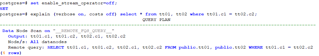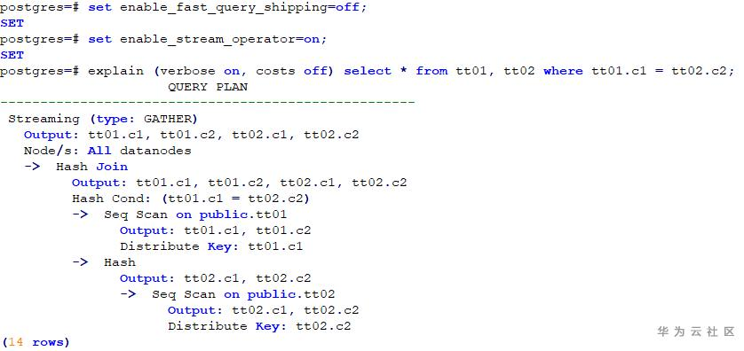 两表JOIN,且其连接条件为各表的分布列,在关闭stream算子的情况下,CN会直接将该语句发送至各DN执行,最后结果在CN汇总。