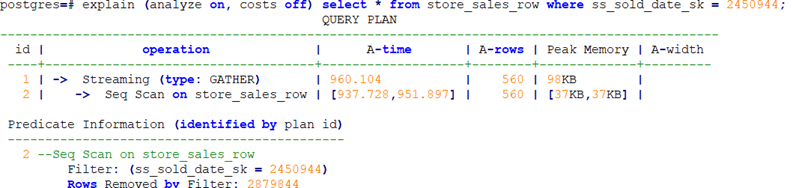上述例子中,全表扫描返回3360条数据,过滤掉大量数据,在sssolddate_sk列上建立索引后,使用IndexScan扫描效率显著提高,从960毫秒提升到8毫秒。