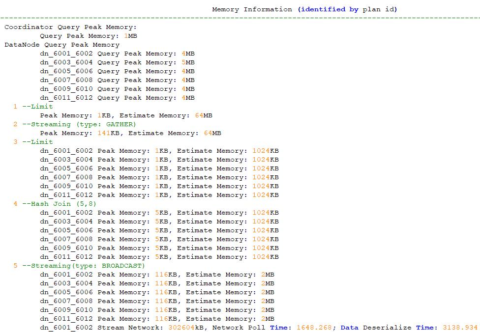 主要显示CN的最大内存用量、DN最大内存用量、各算子的最大内存用量、各算子预估内存用量、Stream线程的启动以及收发时间。