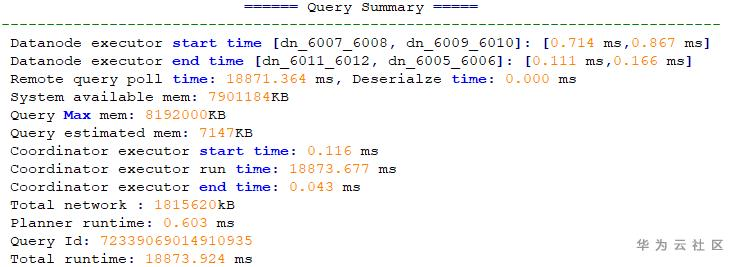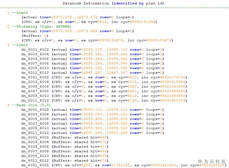 每个算子执行的过程都有CPU信息,其中cyc代表的是CPU的周期数,ex cyc表示的是当前算子的周期数,不包含其子节点;inc cyc是包含子节点的周期数;ex row是当前算子输出的数据行数;ex c/r则是ex cyc/ex row得到的每条数据所用的平均周期数。