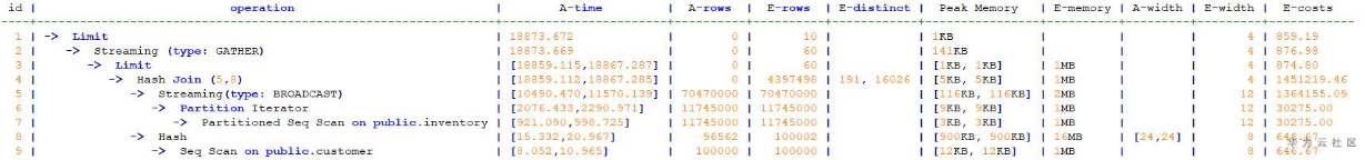 在该计划中,7号节点和9号节点为叶子节点,其余节点均为非叶子简介。1号节点时顶层节点,所以该节点的执行时间就可以作为整个查询的执行时间。