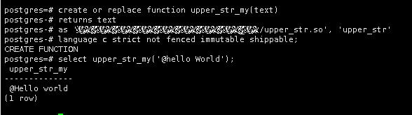 create or replace function upper_str_my(text) returns text as 'xxxxxx/upper_str.so', 'upper_str' language c strict not fenced immutable shippable;