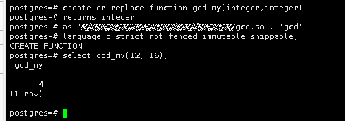 create or replace function gcd_my(integer,integer) returns integer as 'xxxxx/gcd.so', 'gcd' language c strict not fenced immutable shippable;