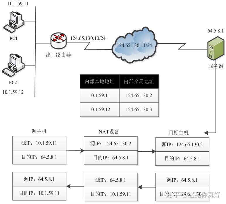 当服务器向PC1返回数据时,IP数据报在公网的源地址为服务器地址64.5.8.1,目的地址为NAT指定的PC1映射公网地址124.65.130.2。当数据报通过出口路由进入内网时,查看NAT地址转换表,执行NAT对IP首部进行重新分装,源地址不变,目的地址转化为NAT指定的PC1映射的私有地址10.1.59.11。