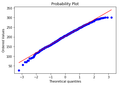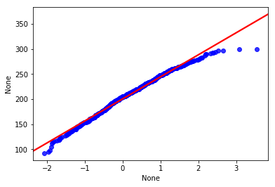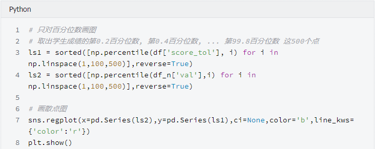 我们画出了和上面几乎一样的图, 但是可以看到, 右侧的点分布在在直线下方, 结果是符合直觉的, 因为正态分布的数据在最右侧需要有一些比较大的数字, 但是学生成绩被总分300 限制住了, 这就印证了一句话,学霸只能考100是因为满分只有100