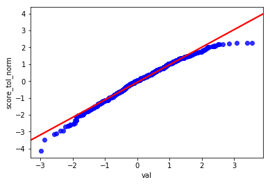 一般认为,Q-Q图的散点需要分布在y=x 直线附近才认为符合正态分布, 为什么散点图分布在y=ax+b附近, 仍然可以认为, score_tol 符合正态分布呢? 因为, 从图中可以看到, score_tol 列可以写成正态分布的列val 的线性函数 score_tol = a * val + b 而正态分布的性质决定了, 如果一个变量x服从正态分布, 那么他的函数ax+b 也符合正态分布。