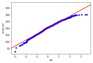 可以看到, 散点图基本在y = ax+b 的附近分布, 这时我们可以说,score_tol 列符合正态分布, 但不是标准正太分布。