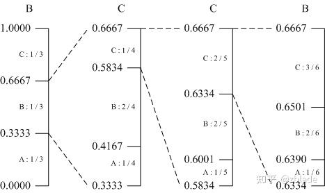 算术编码是一种无限接近熵编码理论值的编码,其本质操作就是用一个[0, 1)的小数来表示最终的编码结果,其基本操作也是基于统计来进行的,用示例图来表示最直观[2]: