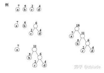 霍夫曼编码是速度最快的熵编码,其基本原理是基于统计的频率,构建二叉树,最后高频率的字符用最短的编码表示,最低频率的字符用最长的编码来表示。其基本的操作就是不断构建二叉树的过程,借鉴示例用图1: